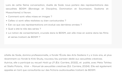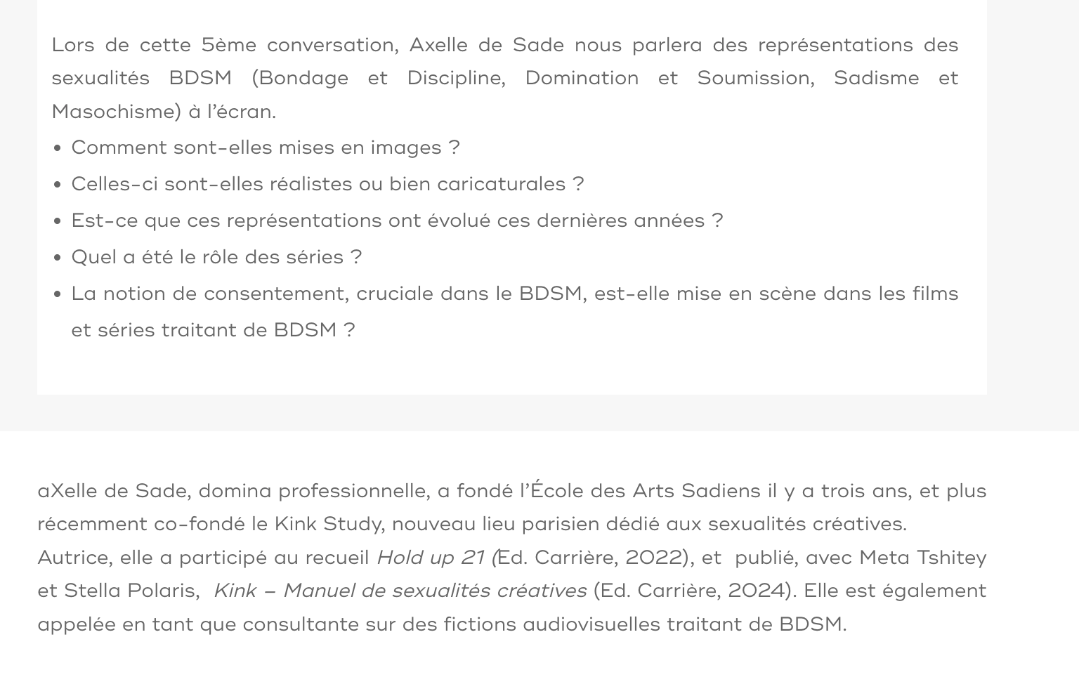 Écrivant depuis une quinzaine d’année sur les questions de sexualités et de féminismes, et travaillant sur des scénarios de séries depuis cinq ans, j’ai vu émerger le métier de coordinatrice d’intimité avec beaucoup d’intérêt. Non seulement il permet aux acteurs, actrices, et équipes de plateau de vivre au mieux les tournages de scènes de nudité et de sexe simulé, mais il apporte beaucoup, en termes d’authenticité, aux fictions intégrant de la sexualité. En résumé, ces dernières années, à chaque fois, qu’en tant que spectatrice je me suis dit : « c’est une super scène de nu/de sexe », j’ai checké, et il y avait derrière une coordinatrice/un coordinateur d’intimité.